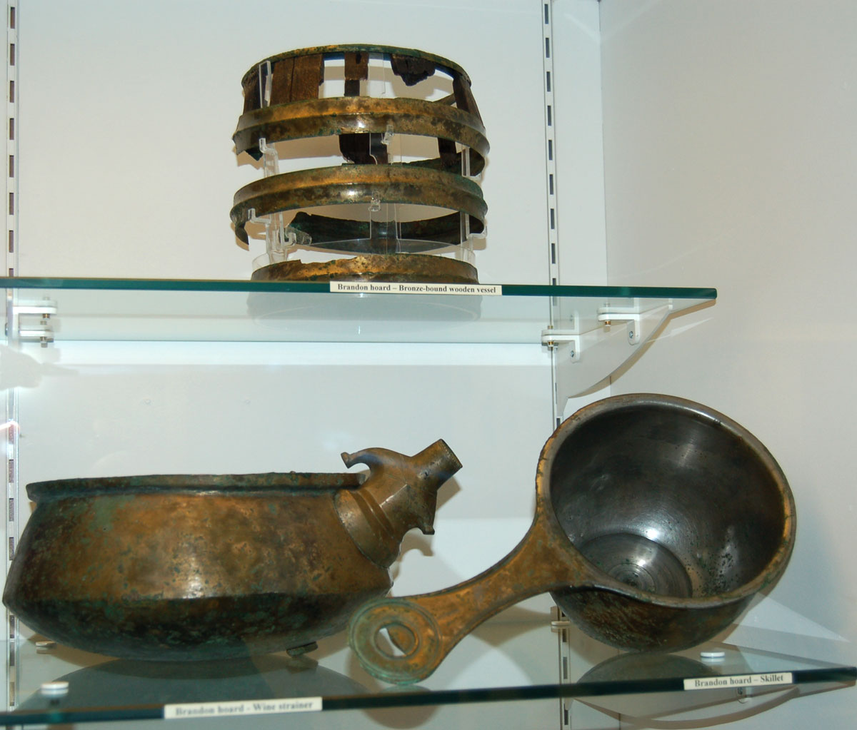 This final object from the Brandon Hoard was a bronze bound wooden bucket or other vessel. Again it was probably a feast object owned by a wealthy local chieftain. This hoard was found during construction of Brandon's Pinefields estate, by Bennett Builders |