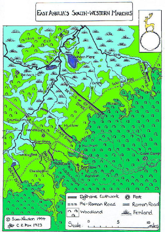 The Devil's Dyke at Newmarket, and the Fleam Dyke, a few miles further to its south west have long been believed by some historians to date from around this time to defend from attack from the west. Recent detailed work has confirmed that these earthworks date from the 5th to the 7th centuries. They are also aligned to face an attack from the south west. There are other earthworks within the area of the East Anglian kingdom, such as Black Ditches on Cavenham Heath and Risby in Suffolk, and the War Banks at Lawshall. These may have more obscure origins.