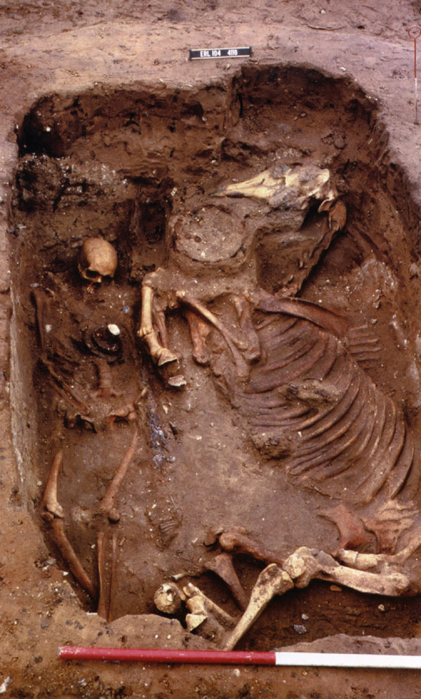 Around 550 a Saxon nobleman was buried with his horse at Eriswell. The site was discovered in 1997 under a baseball pitch scheduled for redevelopment on the USAF base at RAF Lakenheath. Some 200 graves were located on the site, spanning a period of 150 years. This is now a completely different form of burial than the earlier cremations exemplified at West Stow.