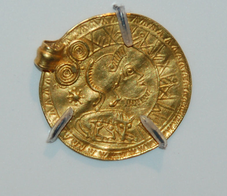 Trade and social contacts were probably maintained with their homelands, as shown by many of the objects that have been found. At Undley, near Lakenheath, a high status Angle wore this gold pendant shown here. It was made in the late 5th century in Schleswig or southern Scandinavia. A roman helmeted head copies many Roman coins, and although the wolf and infants is a strong Roman motif, there are also runic characters present. Such a pendant, made from a pattern stamped into flattened gold, is known as a bracteate.