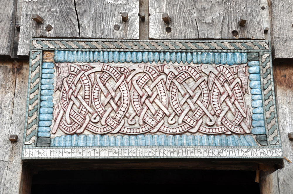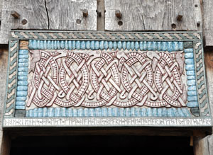 The Hall (H2) Once again, the decorative carving is not supported by excavated evidence. However, as a communal building and a focus for the family group, such decoration does not seem inappropriate. The design itself is from a die plate found on site. |