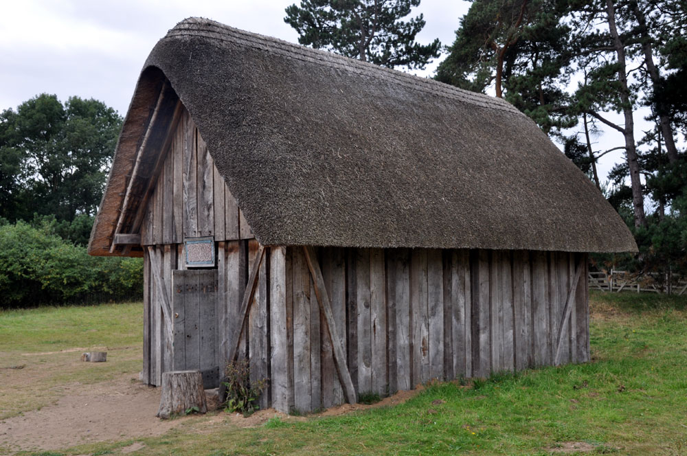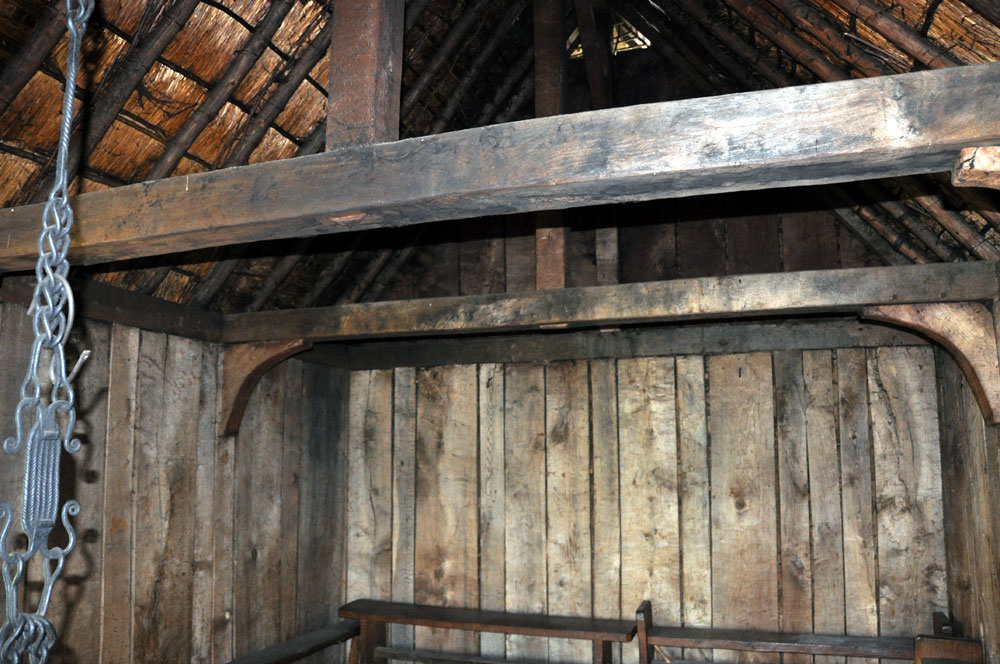 The Hall (H2) The timbers used were roughly squared by having their soft sapwood removed and the walls, rather than central posts, support the weight of the roof. Like the original buildings, the 1980 hall was repaired with wooden buttresses to give support. By 1999 this structure had become unsafe and was closed, and then demolished in 2000. Taking the building down provided more valuable evidence of the viability or otherwise of the construction methods used. By 2005 it was completely rebuilt. |
