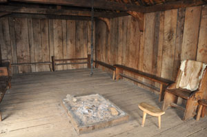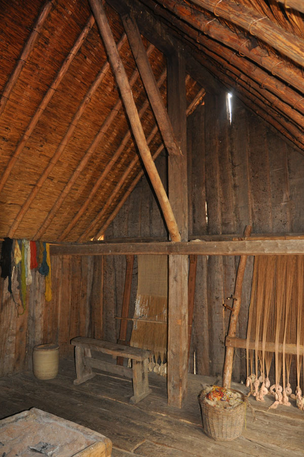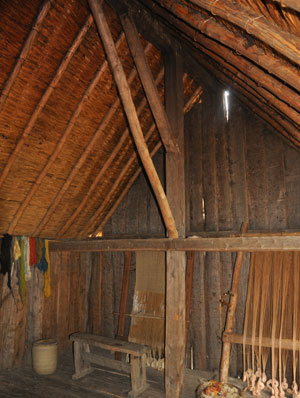 The Weaving House (SFB 20) View of the interior of the Weaving House. This building has been fitted out with looms as a weaving shed, as one of the burned houses contained the remains of several looms. Some of the buildings, like this one, appear to have been used for working in, and others for living in. A clay hearth was installed in 1983, but vibrations from floorboards cracked it. In 1992 a new hearth made of an oaken box replaced it, and is seen here.