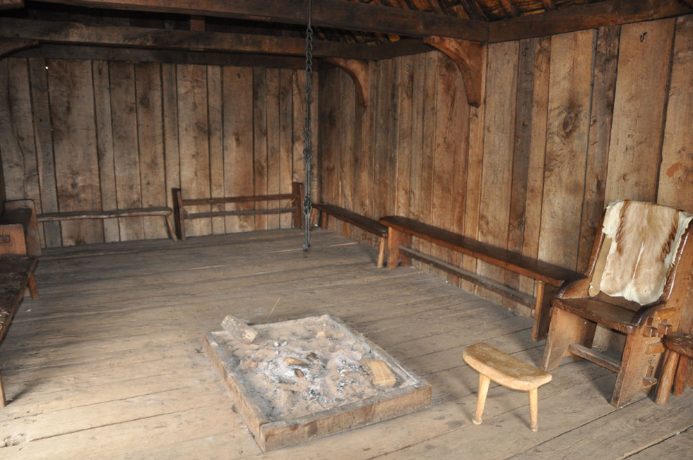 The Hall (H2) There was no pit below the hall, and the first reconstructed hearth was laid on the subsoil. The plank floor was added in 1987 to alleviate the problem of dust. In 2005 the hearth was rebuilt in the form of the raised box of sand seen here. |